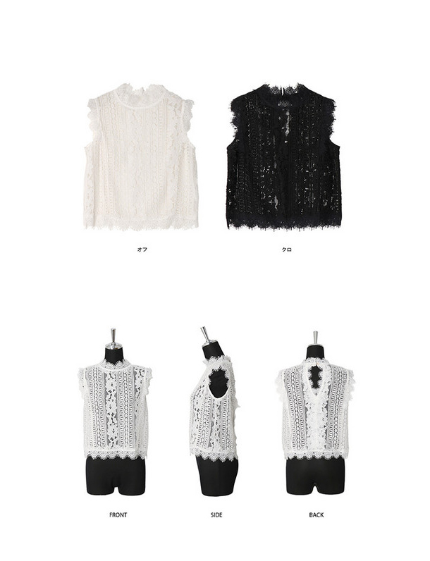 大人気の「神レーストップ」の新作登場! 繊細なレースを贅沢に使った、大人デザイン。 プチハイネック×ノースリーブで女のコらしさ溢れる一枚です。 後ろの首もとは抜きで、ゴールドのボタンつき。 ※一枚では透けますのでインナーをご着用ください。 ※表記はFサイズとなっていますが、通常Mサイズくらいのサイズ感です。