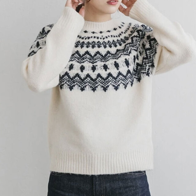 洗えるニット クルーネックニット ふんわりノルディック柄ニット ジャガードニット