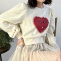 立体的なビジューを散りばめた裏起毛のハートプリントプルオーバー。裏起毛ハートプリントビジュー付ショート丈トップス