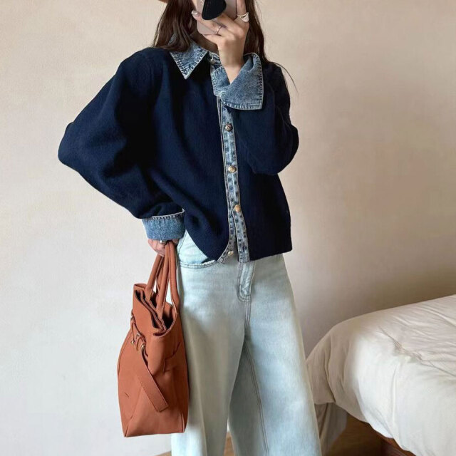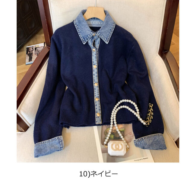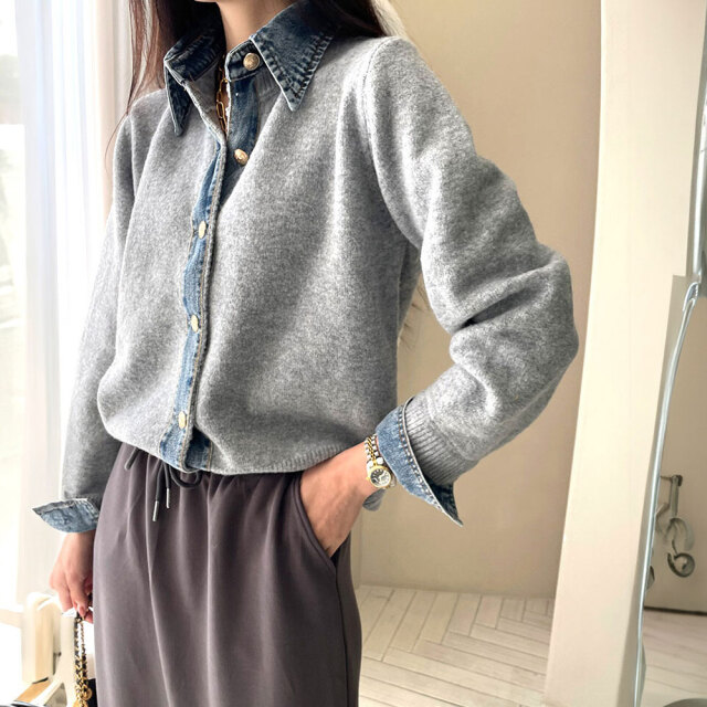 デニム×ニットの異素材切替デザインが、個性的なカーディガンです。
